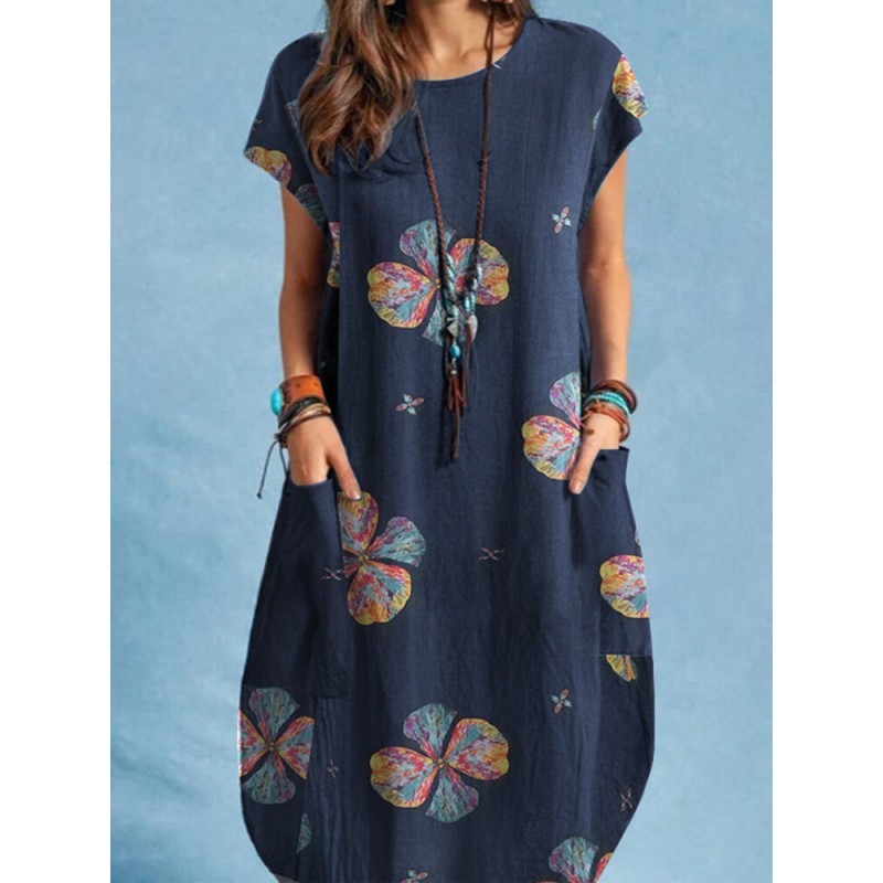 Cotton Plant Print Pocket Short Sleeve Casual Dress